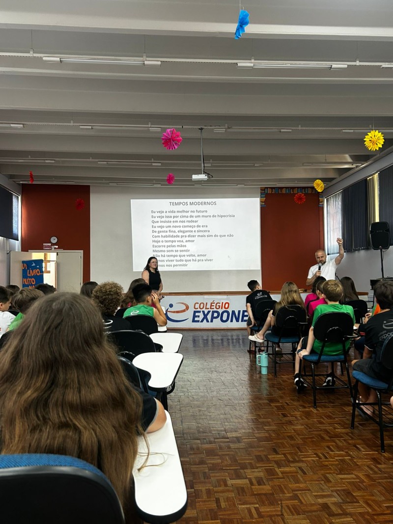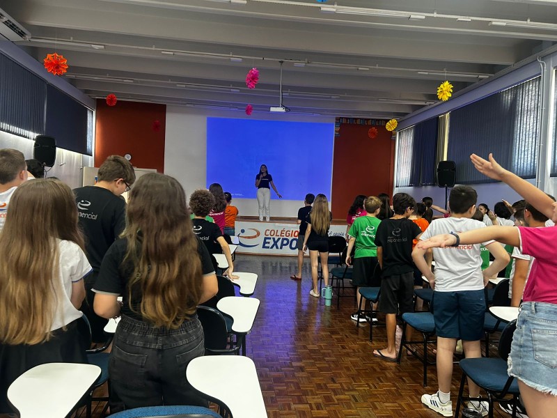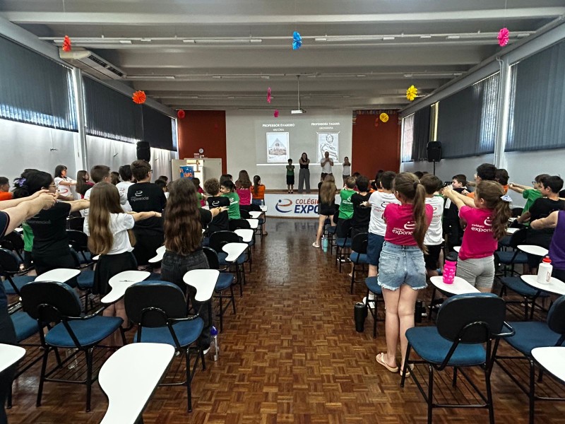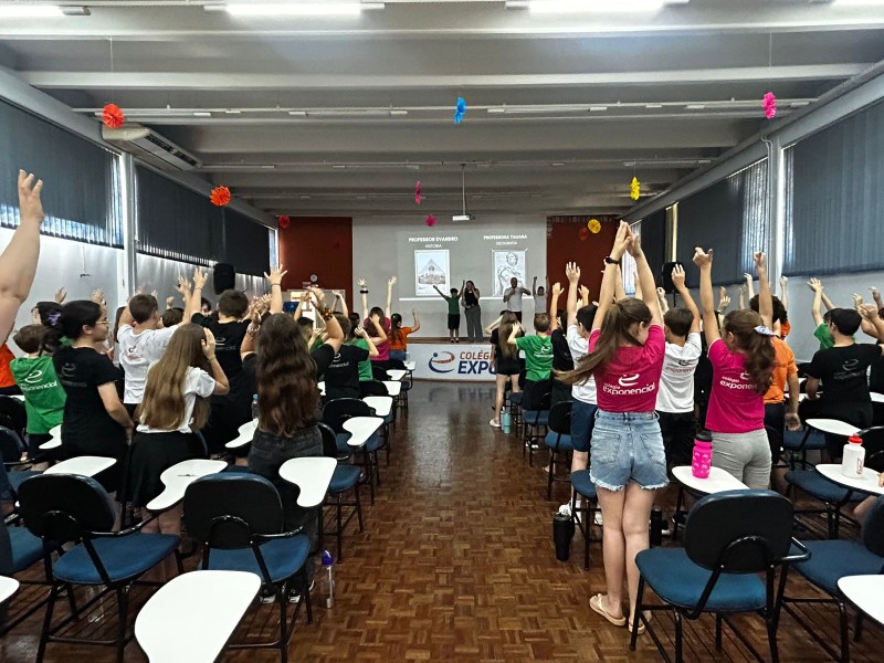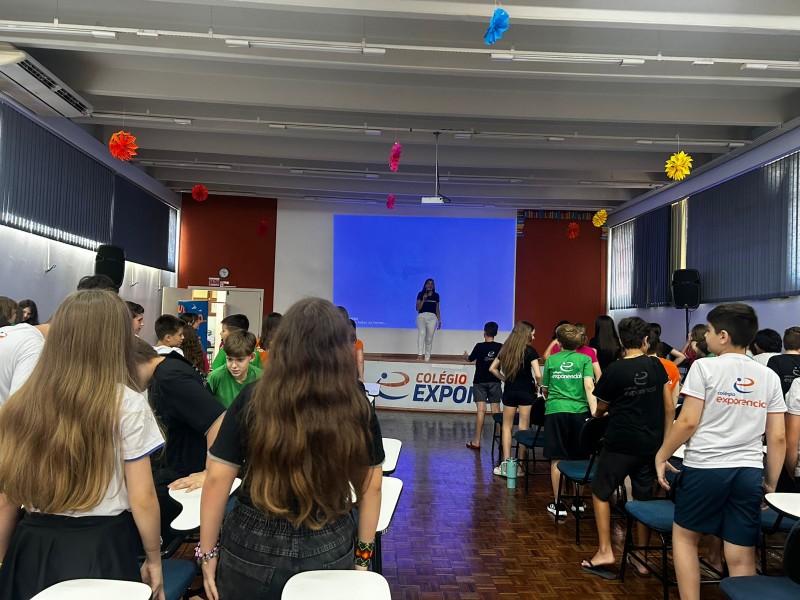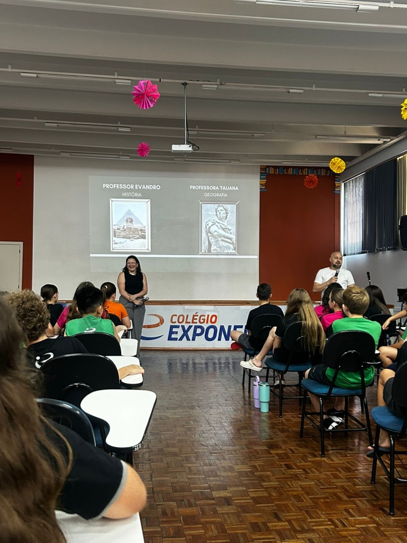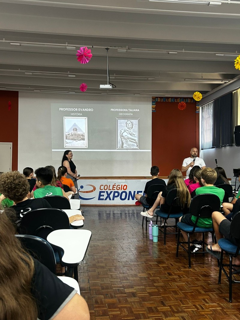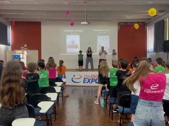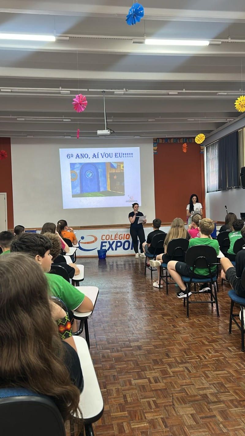 Professores dos 6º anos - Ensino Fundamental 2 em apresentação para os 5º anos com o tema - 6º ano, lá vou eu! Eles divulgaram aos estudantes como será o EF2, principalmente o 6º ano em 2026. O objetivo principal é deixar os alunos mais seguros para frequentar o novo nível de ensino, o Ensino Fundamental 2. Foi um momento muito bacana de diálogos, apresentações, brincadeiras... e depois os 5º anos participaram de atividades recreativas e de interação entre colegas como encerramento do ano letivo.