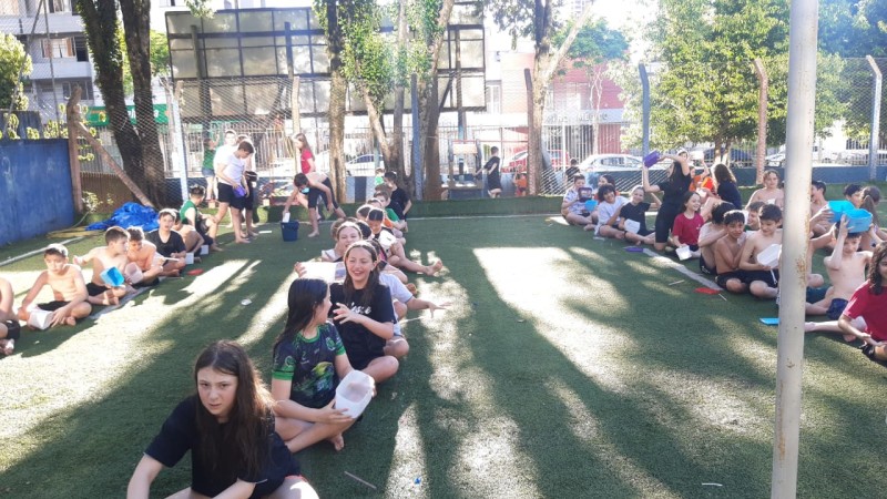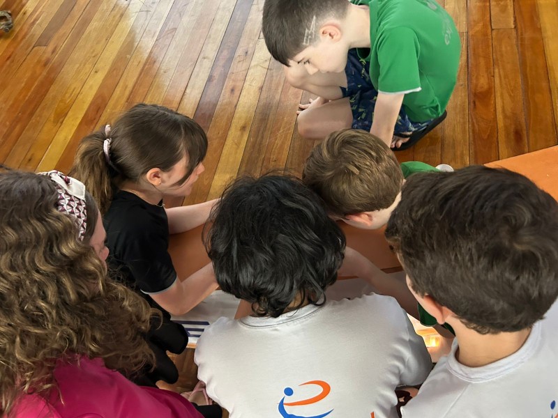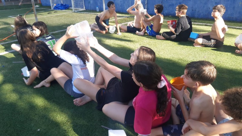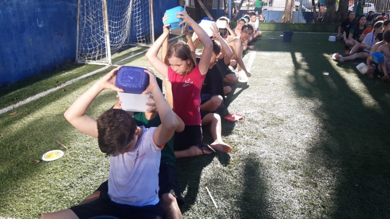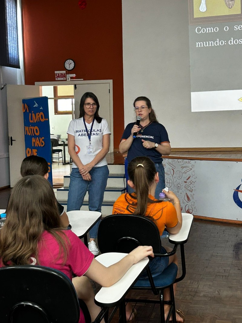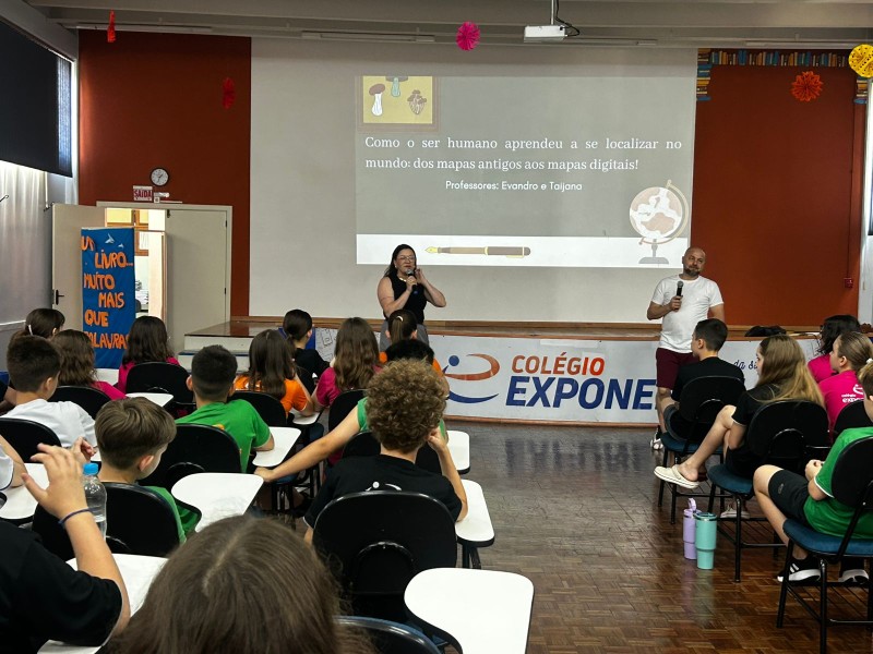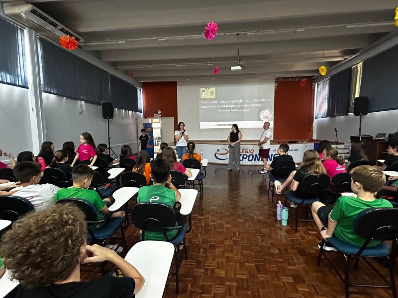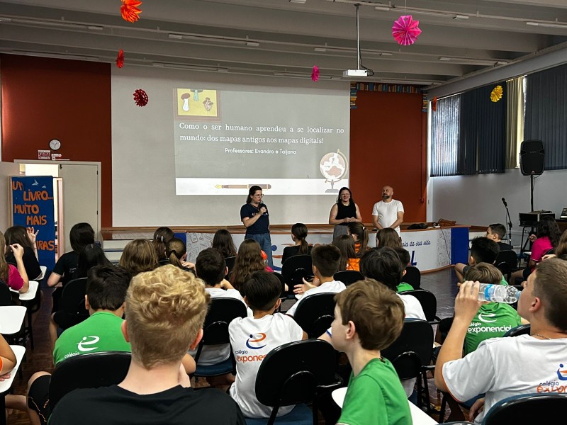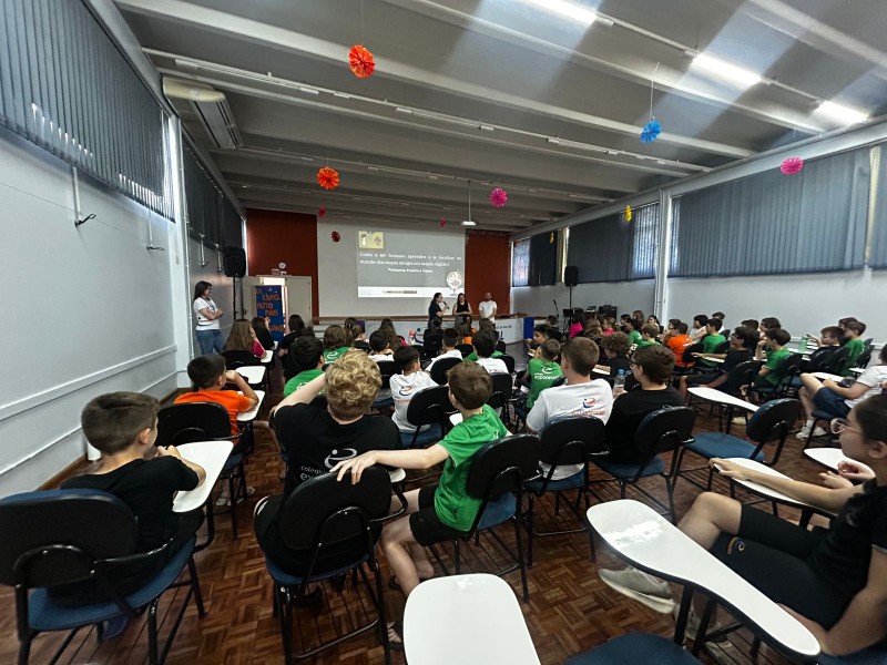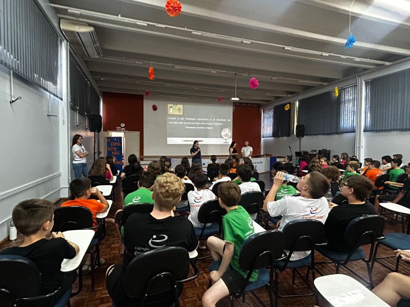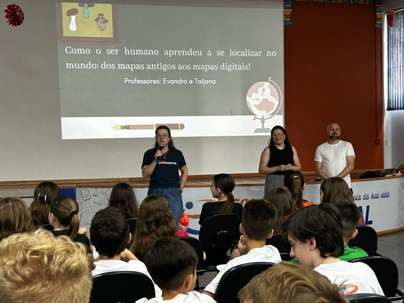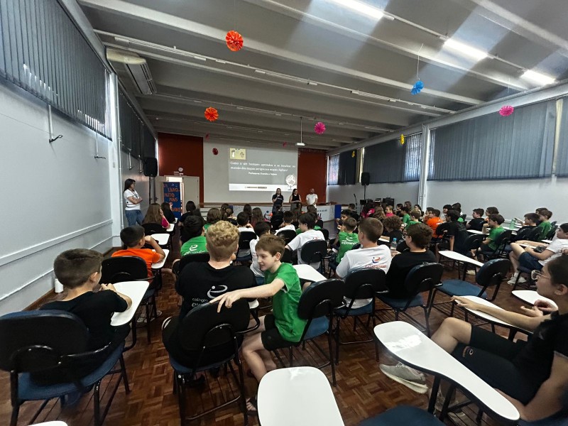 Professores dos 6º anos - Ensino Fundamental 2 em apresentação para os 5º anos com o tema - 6º ano, lá vou eu! Eles divulgaram aos estudantes como será o EF2, principalmente o 6º ano em 2026. O objetivo principal é deixar os alunos mais seguros para frequentar o novo nível de ensino, o Ensino Fundamental 2. Foi um momento muito bacana de diálogos, apresentações, brincadeiras... e depois os 5º anos participaram de atividades recreativas e de interação entre colegas como encerramento do ano letivo.