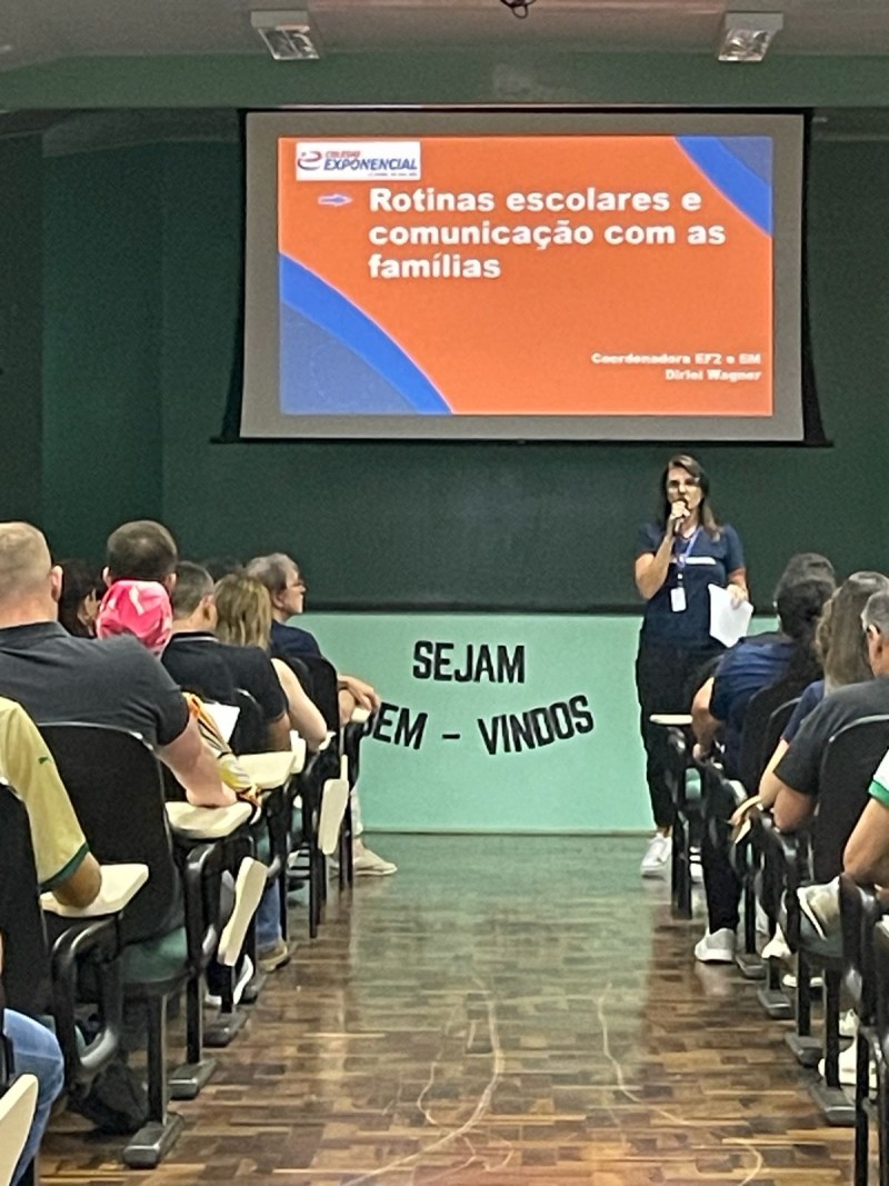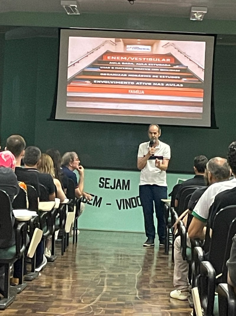 Em 12.02.26 o Colégio Exponencial acolheu os pais dos estudantes do Ensino Médio para um encontro formativo e de diálogo. Durante a reunião, foram abordados temas de grande relevância para a formação integral dos alunos, como o uso de telas e seus impactos, bullying, racismo e a importância dos valores para a vida. Também foram apresentadas orientações sobre a organização da rotina de estudos, o uso adequado do material didático e estratégias para a conquista do “passaporte” para o Enem e os vestibulares. A expressiva participação das famílias fortaleceu ainda mais a parceria entre escola e família, reafirmando o compromisso conjunto com o desenvolvimento acadêmico e humano dos estudantes.