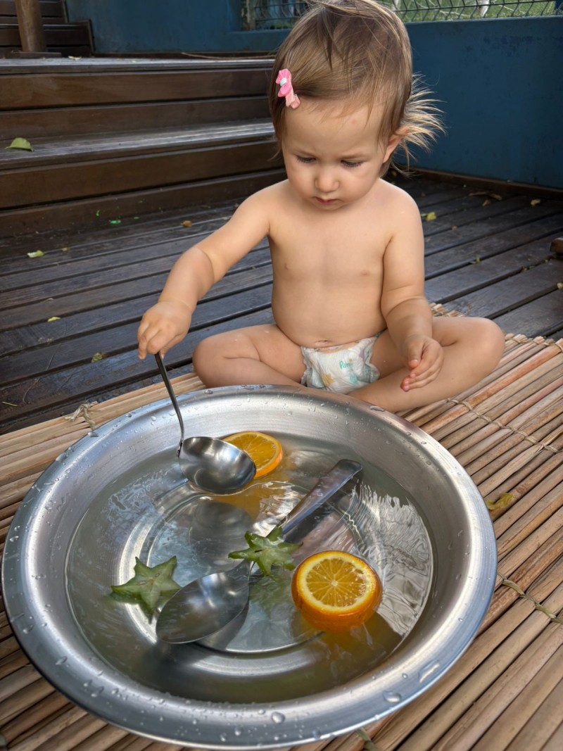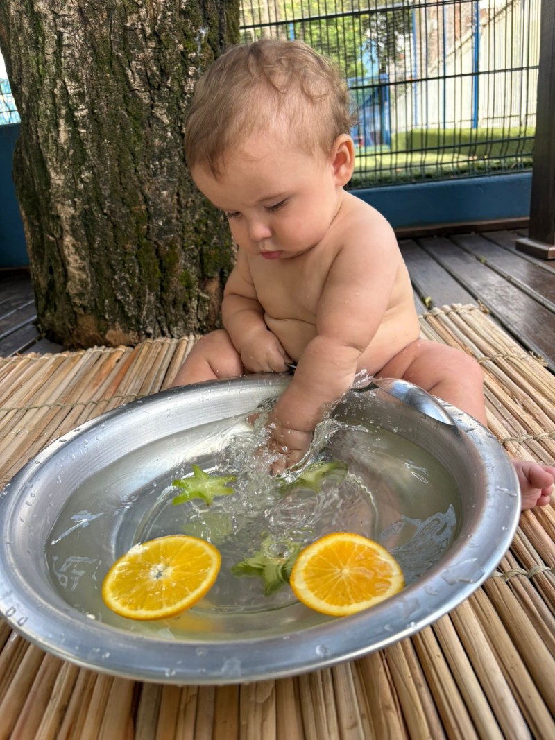 Maternal, exporando o mundo com suas pequeninas mãos. Nesse convite à investigação os bebês descobriram cheiros e diferentes texturas, da turma do Infantil 1 - Professora Kauana. Se o mundo é feito de cheiros, cores, sons e texturas… a infância precisa atravessar tudo isso com o corpo inteiro. Cada momento mexendo na água, com objetos e com as maõzinhas, é um exercício invisível de equilíbrio, coordenação, percepção e autonomia. A criança não aprende só olhando — ela aprende sentindo, experimentando, comparando, ajustando.