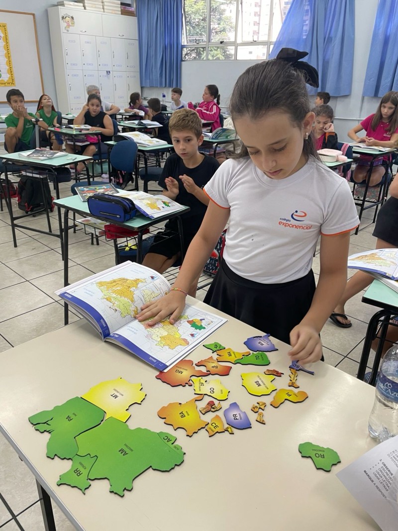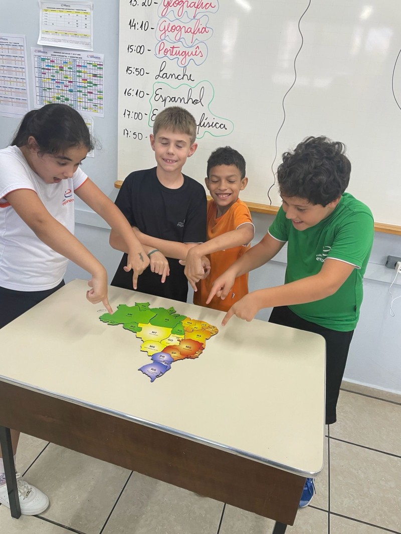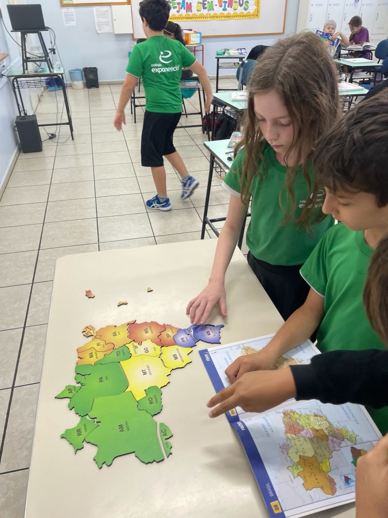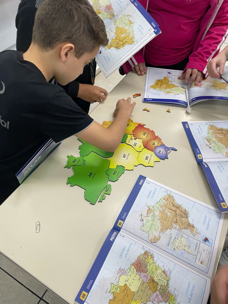 Estudo fundamental para compreender a complexidade territorial, cultural, econômica e social do Brasil. Para começar, a turma 42 foi estimulada pela professora Heidi a um desafio lúdico, em grupos de alunos, que deveriam montar o mapa político do Brasil, usando um quebra-cabeça. O objetivo foi identificar onde fica cada estado, desafio que exigiu material para pesquisar... Como montar algo desconhecido? Foi necessário procurar no atlas para descobrir!