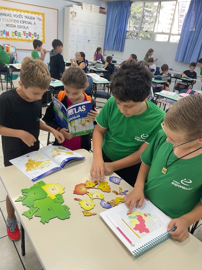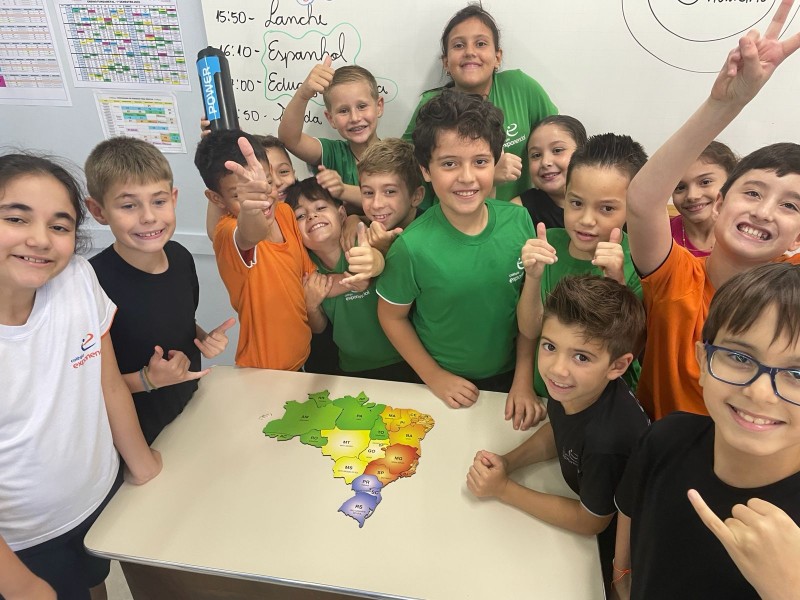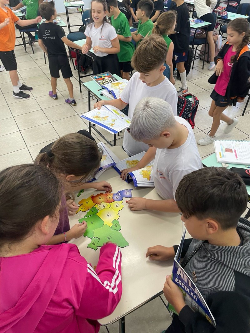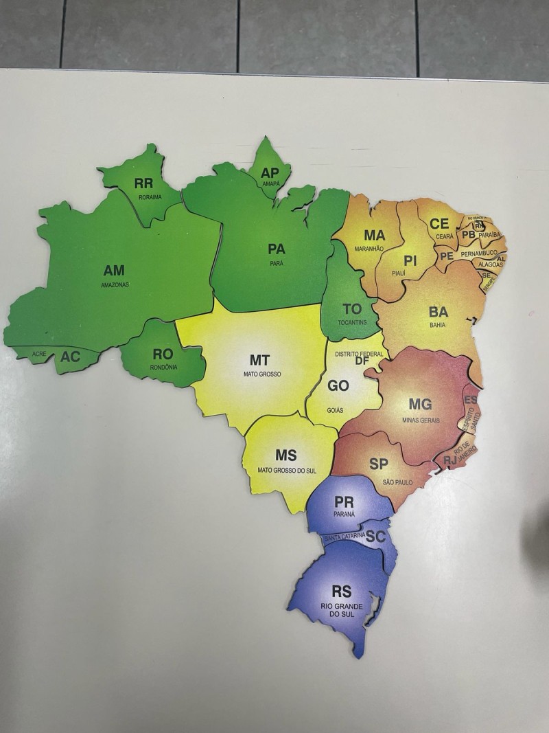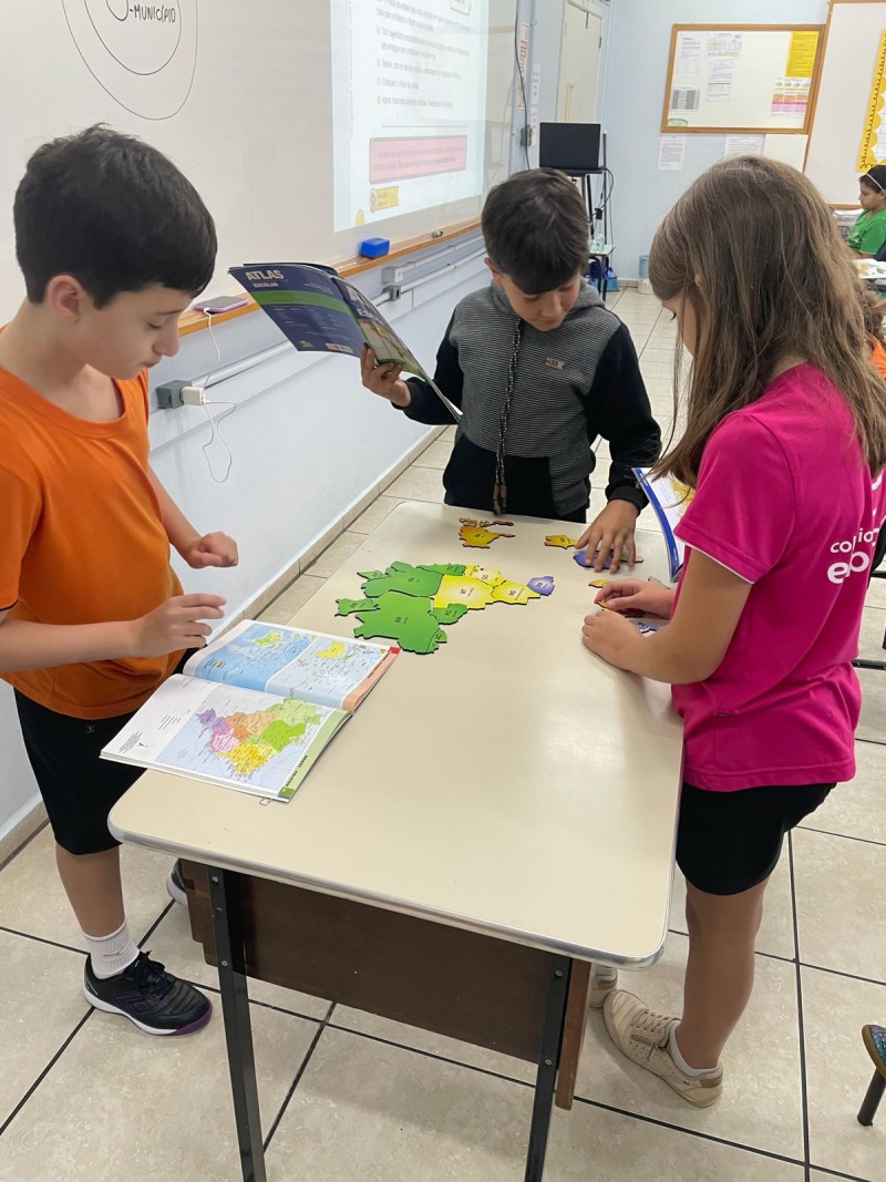 Estudo fundamental para compreender a complexidade territorial, cultural, econômica e social do Brasil. Para começar, a turma 42 foi estimulada pela professora Heidi a um desafio lúdico, em grupos de alunos, que deveriam montar o mapa político do Brasil, usando um quebra-cabeça. O objetivo foi identificar onde fica cada estado, desafio que exigiu material para pesquisar... Como montar algo desconhecido? Foi necessário procurar no atlas para descobrir!