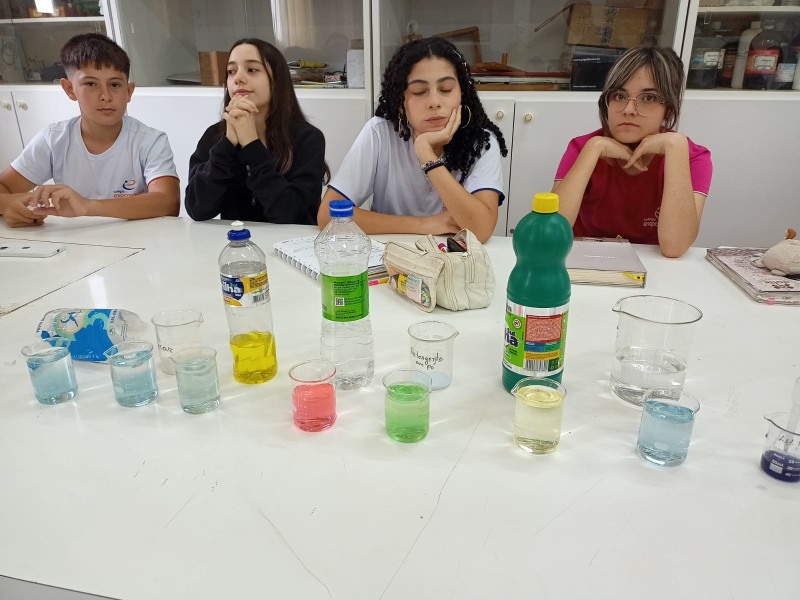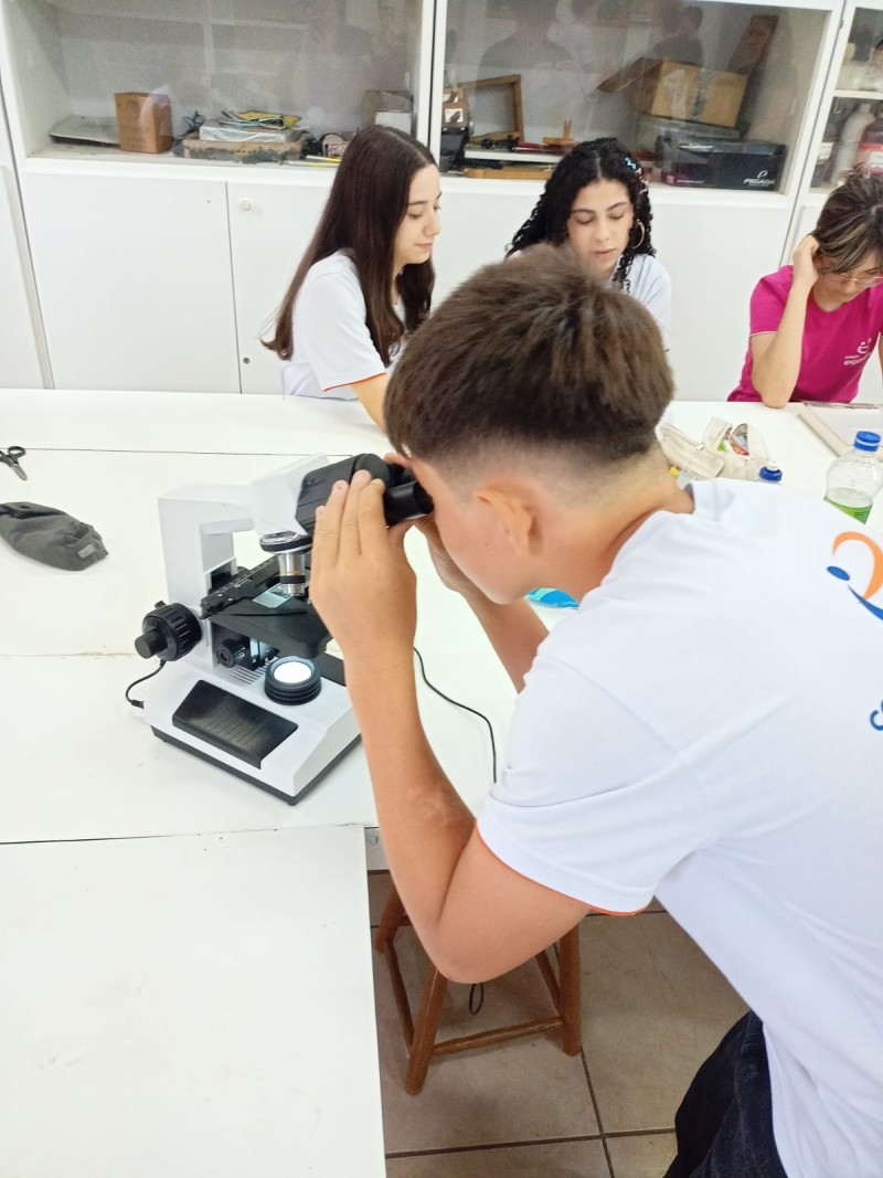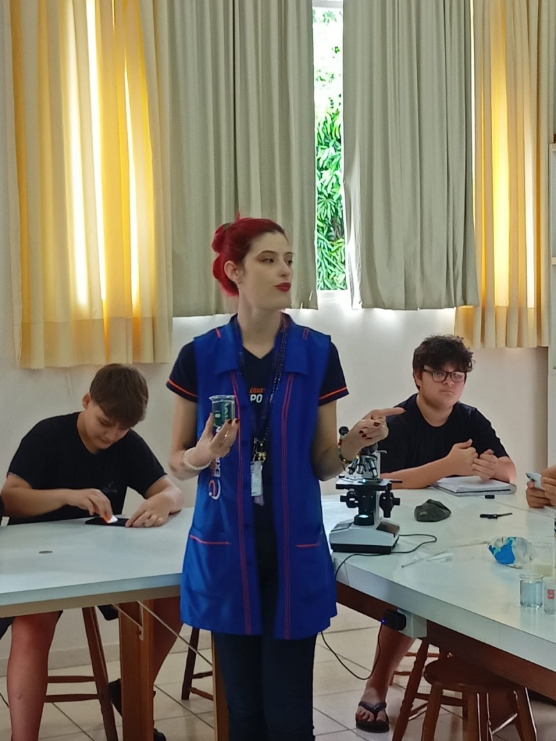 Aula no Laboratório de Ciências com os 9º anos (091 e 092) sob a orientação da Profª Rafaela. Prática de indicadores de pH, e observação da transformação física de substâncias (fármacos para diabetes) no microscópio🔬🧪