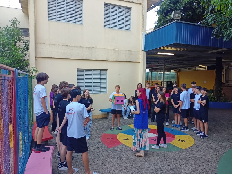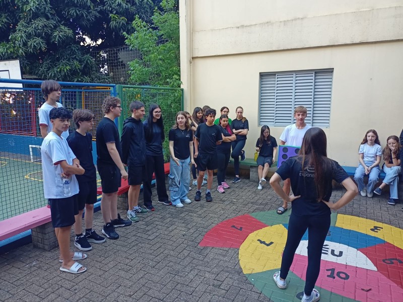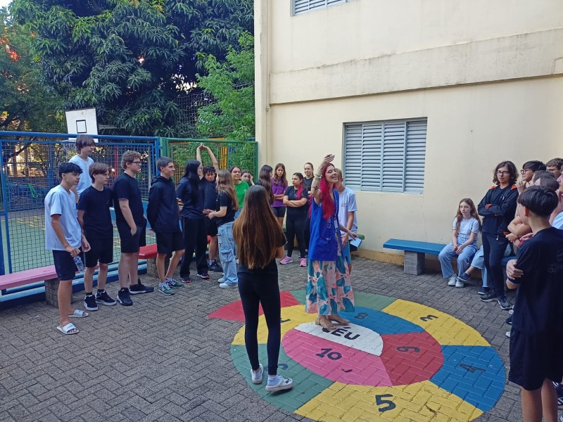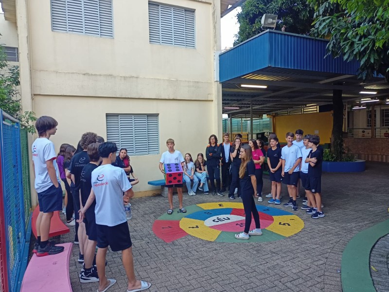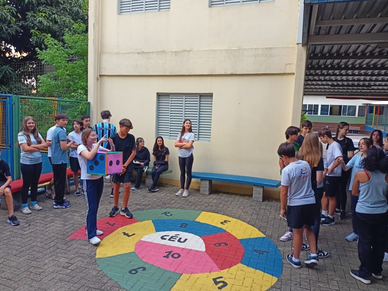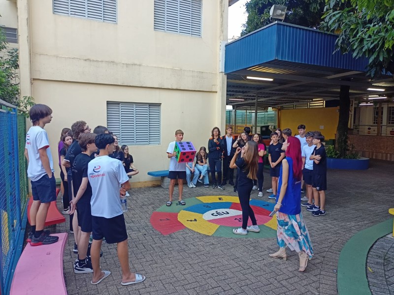 Jogo Cósmico com as turmas dos 9º anos, (091 e 092). Professora Rafaela desafiou os estudantes ao jogo de tabuleiro gigante, divididos em duas equipes, eles responderam a questões sobre o Sistema Solar e Ciclo Estrelar✨🪐🌍🌕☄️
