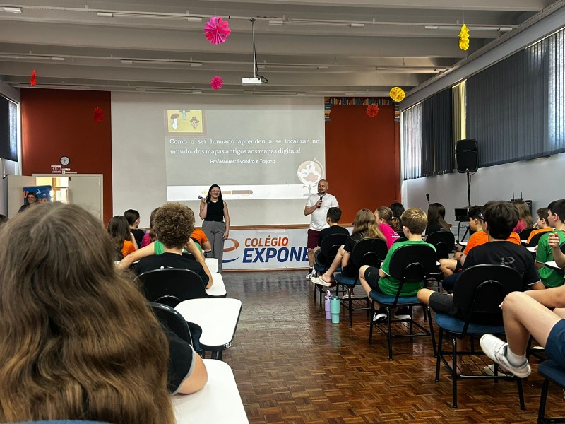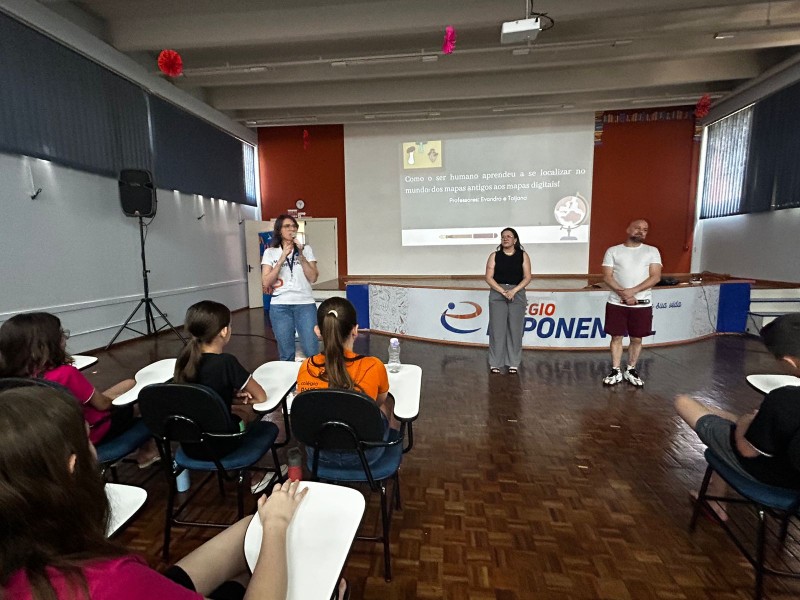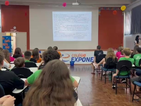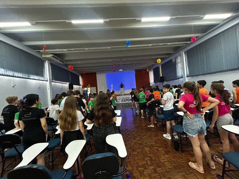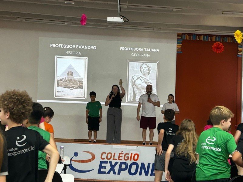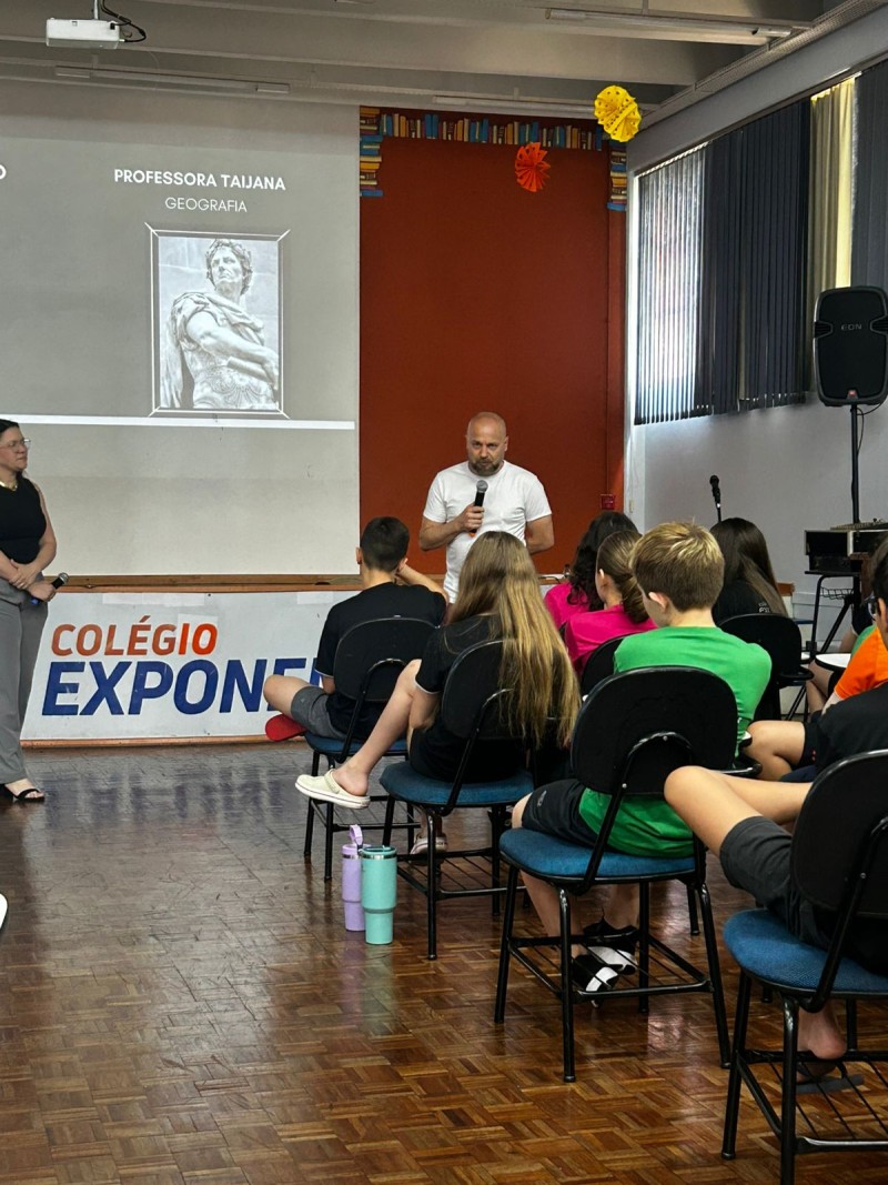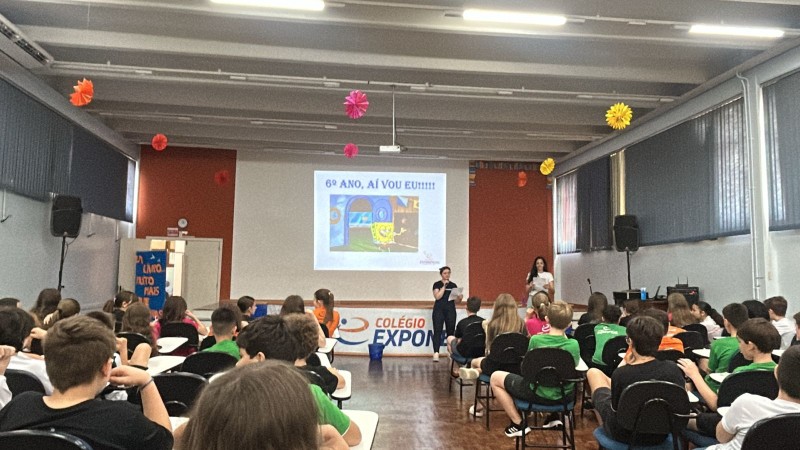 Professores dos 6º anos - Ensino Fundamental 2 em apresentação para os 5º anos com o tema - 6º ano, lá vou eu! Eles divulgaram aos estudantes como será o EF2, principalmente o 6º ano em 2026. O objetivo principal é deixar os alunos mais seguros para frequentar o novo nível de ensino, o Ensino Fundamental 2. Foi um momento muito bacana de diálogos, apresentações, brincadeiras... e depois os 5º anos participaram de atividades recreativas e de interação entre colegas como encerramento do ano letivo.