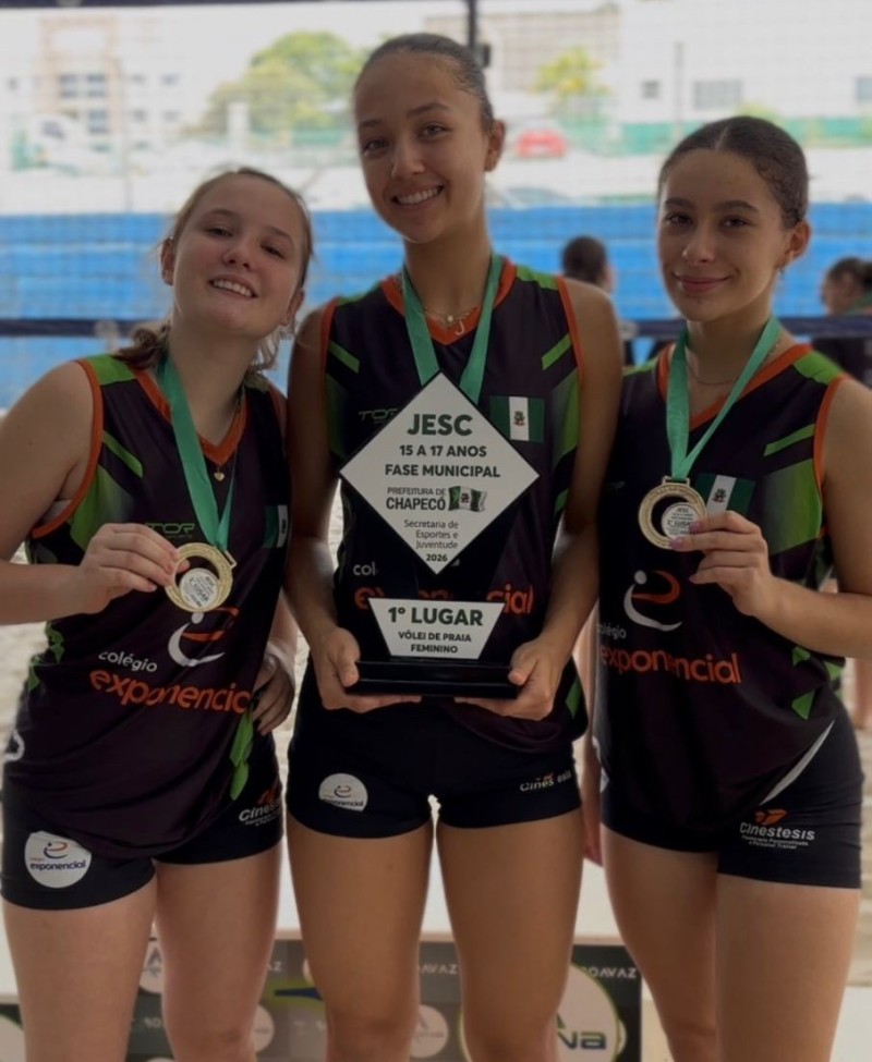 🏐🥇 Campãs do Vôlei de Praia! As atletas Júlia Cheung Zilneyk, Clara Fruet e Valentina Ferronato conquistaram um grande resultado e sagraram-se campeãs na modalidade de Vôlei de Praia, na categoria 15 a 17 anos, durante a etapa dos Jogos Escolares de Santa Catarina (JESC). Com muita garra, talento e espírito de equipe, as atletas mostraram excelente desempenho em quadra e garantiram o lugar mais alto do pódio. Com essa conquista, as campeãs representarão o município de Chapecó na próxima fase do JESC, levando consigo o orgulho de toda a comunidade escolar. 👏 Parabéns às atletas pela dedicação e pela bela conquista! Seguimos na torcida para as próximas etapas! 💪🏐 Professora Baby a mil com as atetlas!