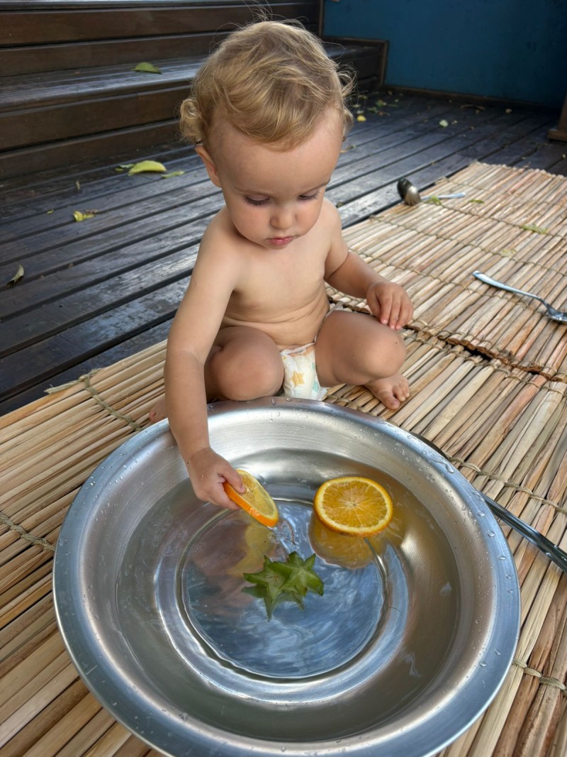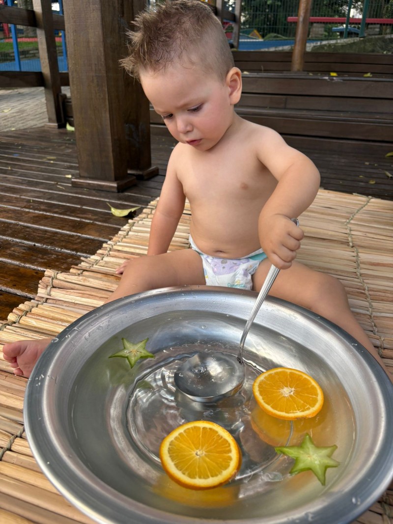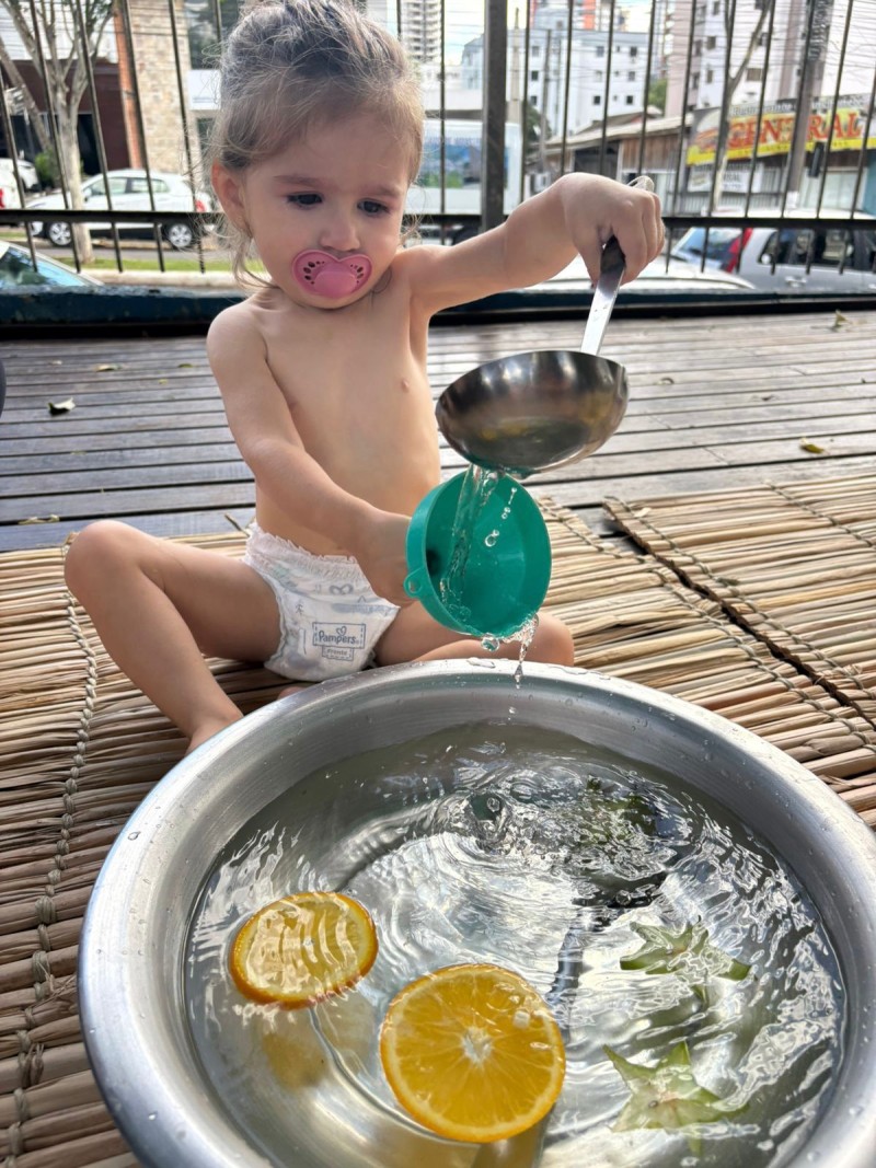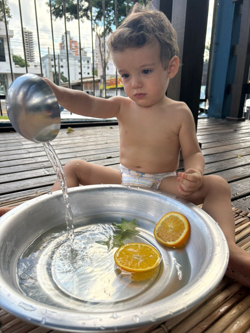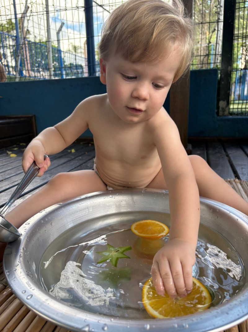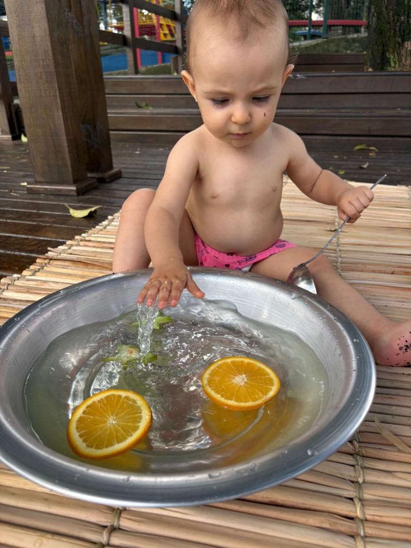 Maternal, exporando o mundo com suas pequeninas mãos. Nesse convite à investigação os bebês descobriram cheiros e diferentes texturas, da turma do Infantil 1 - Professora Kauana. Se o mundo é feito de cheiros, cores, sons e texturas… a infância precisa atravessar tudo isso com o corpo inteiro. Cada momento mexendo na água, com objetos e com as maõzinhas, é um exercício invisível de equilíbrio, coordenação, percepção e autonomia. A criança não aprende só olhando — ela aprende sentindo, experimentando, comparando, ajustando.