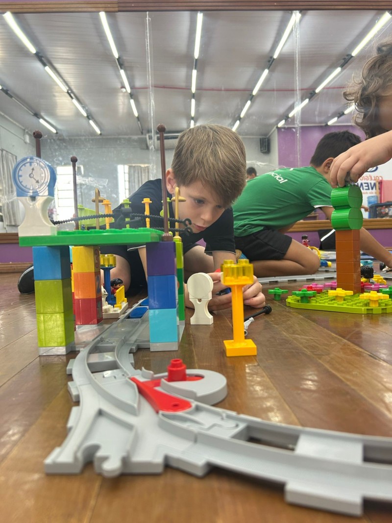 Oficina de Robótica Kids, do Tempo Integral - Professora Kassiana - nela os alunos iniciaram uma aventura muito especial com o personagem Stem. Tudo começou com um sonho, em que Stem realizava muitas viagens de trem, avião e barco. Nessa aventura, ele convidou as crianças para embarcarem com ele em uma viagem de trem .Durante a aula, os alunos conheceram um pouco sobre a “Macuca”, o primeiro trem da cidade de Blumenau. Também assistiram a um vídeo com curiosidades, aprendendo como esse trem era utilizado na época de sua construção. Depois desse momento de descoberta, os alunos foram desafiados a colocar a mão na massa! Construíram trilhos, um trenzinho e um posto de combustível. Nesse posto, utilizaram o bloco azul para criar sons e movimentos, simulando o momento em que o trem parava para abastecer e seguir viagem. A atividade envolveu muita criatividade, concentração e diversão!eçou com um sonho, em que Stem realizava muitas viagens de trem, avião e barco. Nessa aventura, ele convidou as crianças para embarcarem com ele em uma viagem de trem .Durante a aula, os alunos conheceram um pouco sobre a “Macuca”, o primeiro trem da cidade de Blumenau. Também assistiram a um vídeo com curiosidades, aprendendo como esse trem era utilizado na época de sua construção. Depois desse momento de descoberta, os alunos foram desafiados a colocar a mão na massa! Construíram trilhos, um trenzinho e um posto de combustível. Nesse posto, utilizaram o bloco azul para criar sons e movimentos, simulando o momento em que o trem parava para abastecer e seguir viagem. A atividade envolveu muita criatividade, concentração e diversão!