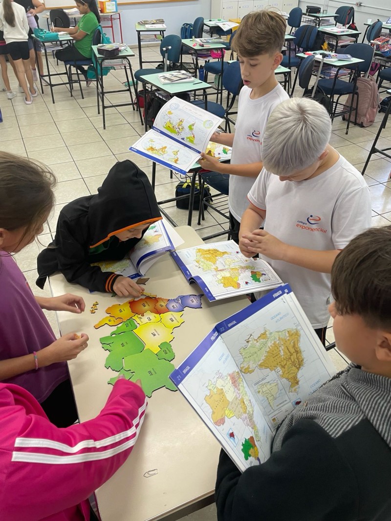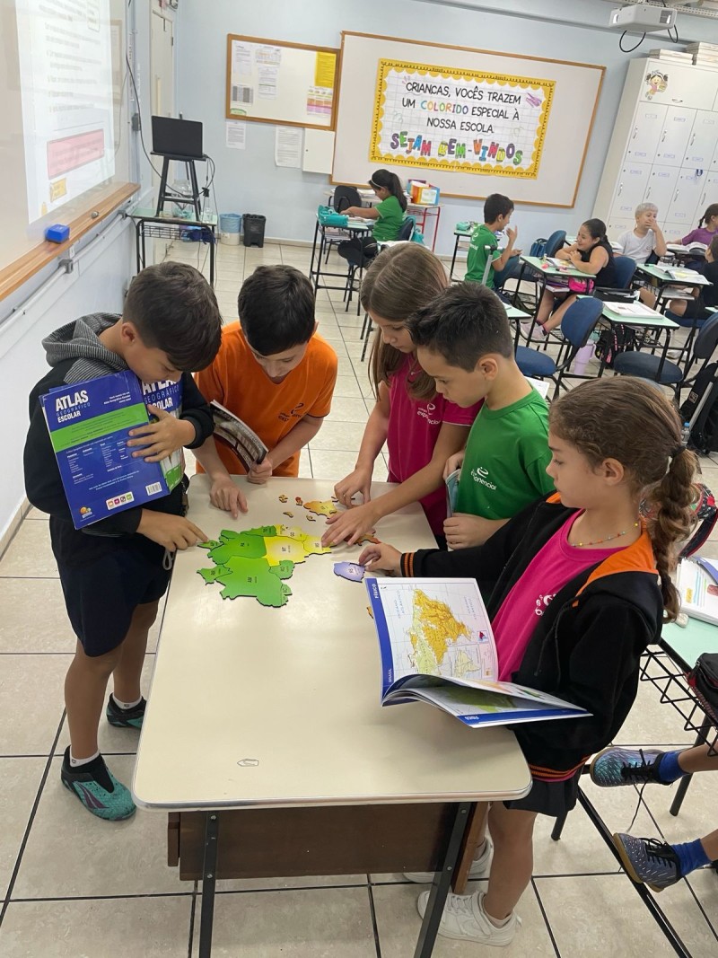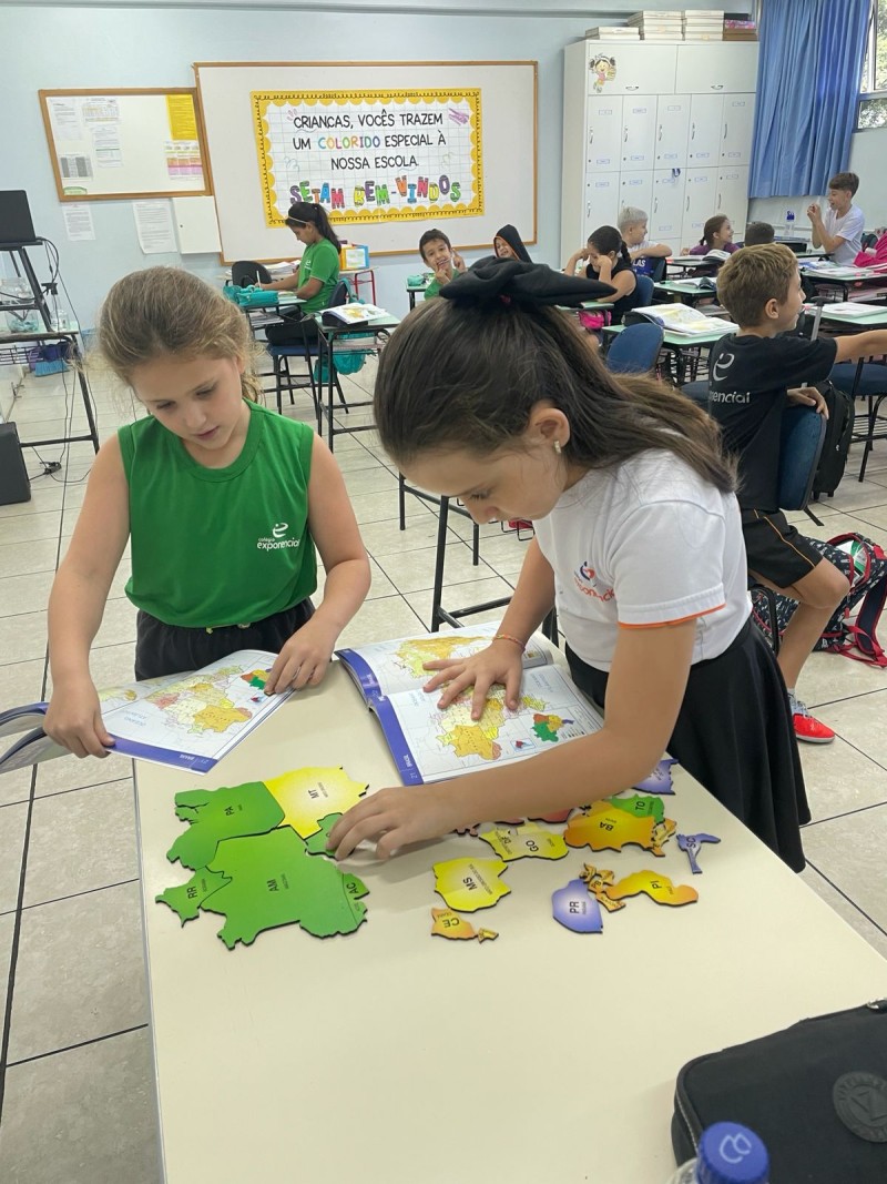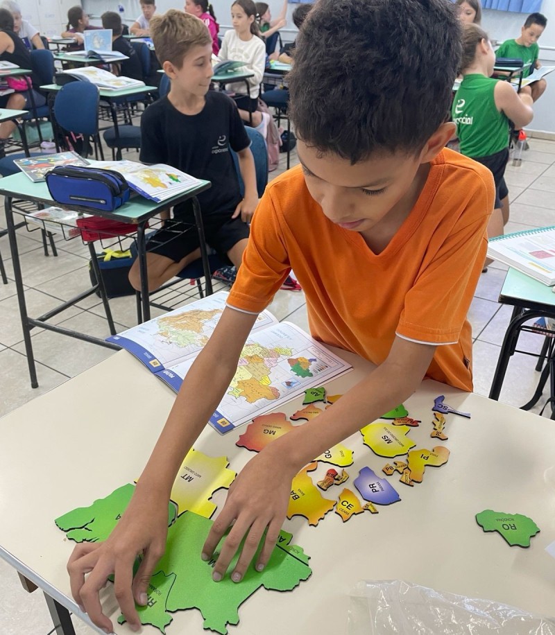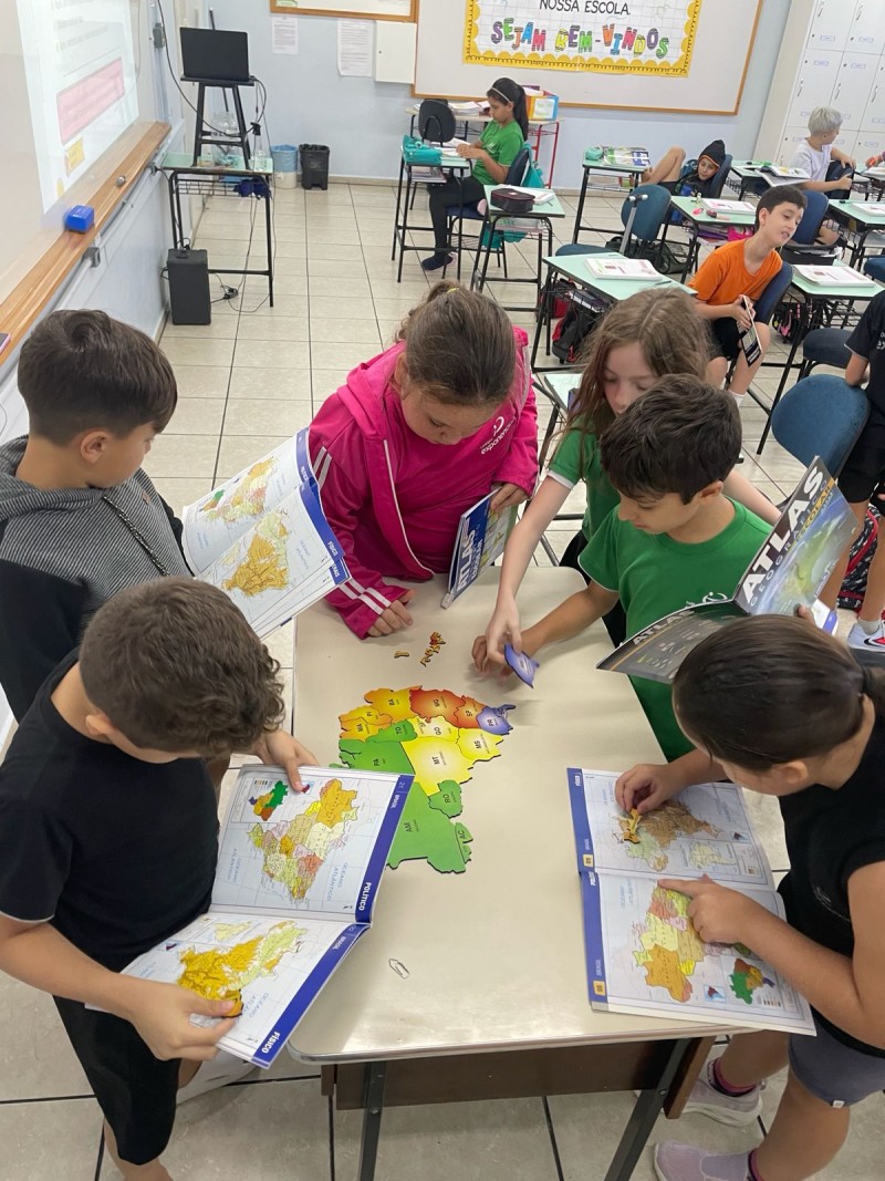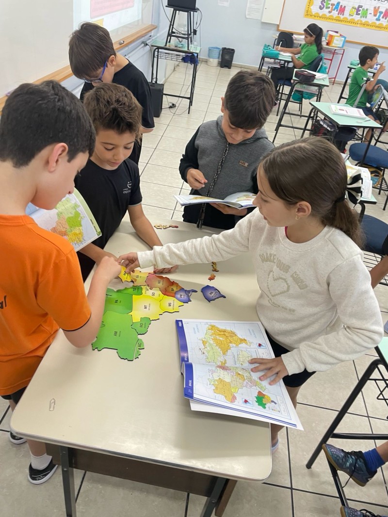 Estudo fundamental para compreender a complexidade territorial, cultural, econômica e social do Brasil. Para começar, a turma 42 foi estimulada pela professora Heidi a um desafio lúdico, em grupos de alunos, que deveriam montar o mapa político do Brasil, usando um quebra-cabeça. O objetivo foi identificar onde fica cada estado, desafio que exigiu material para pesquisar... Como montar algo desconhecido? Foi necessário procurar no atlas para descobrir!